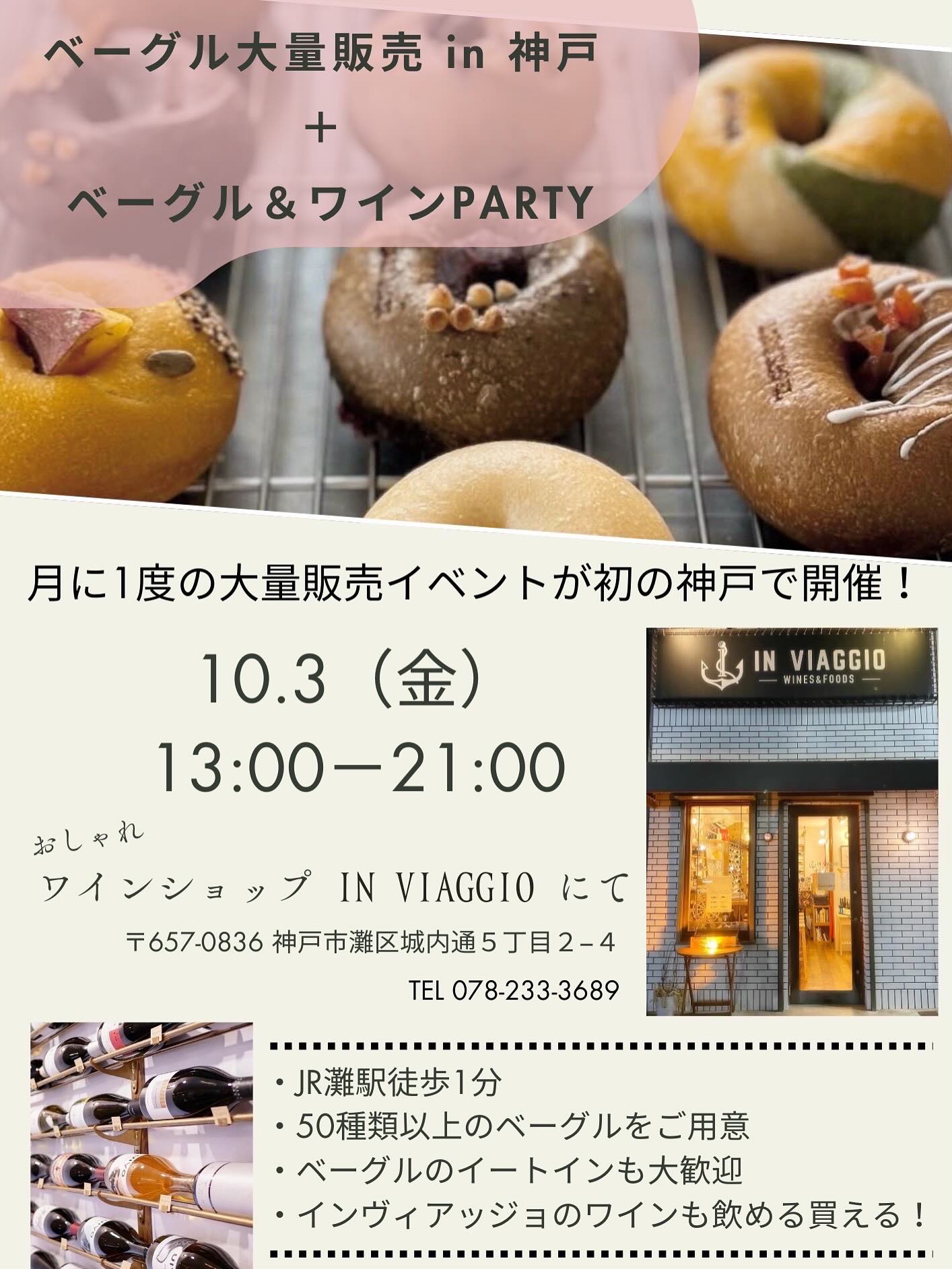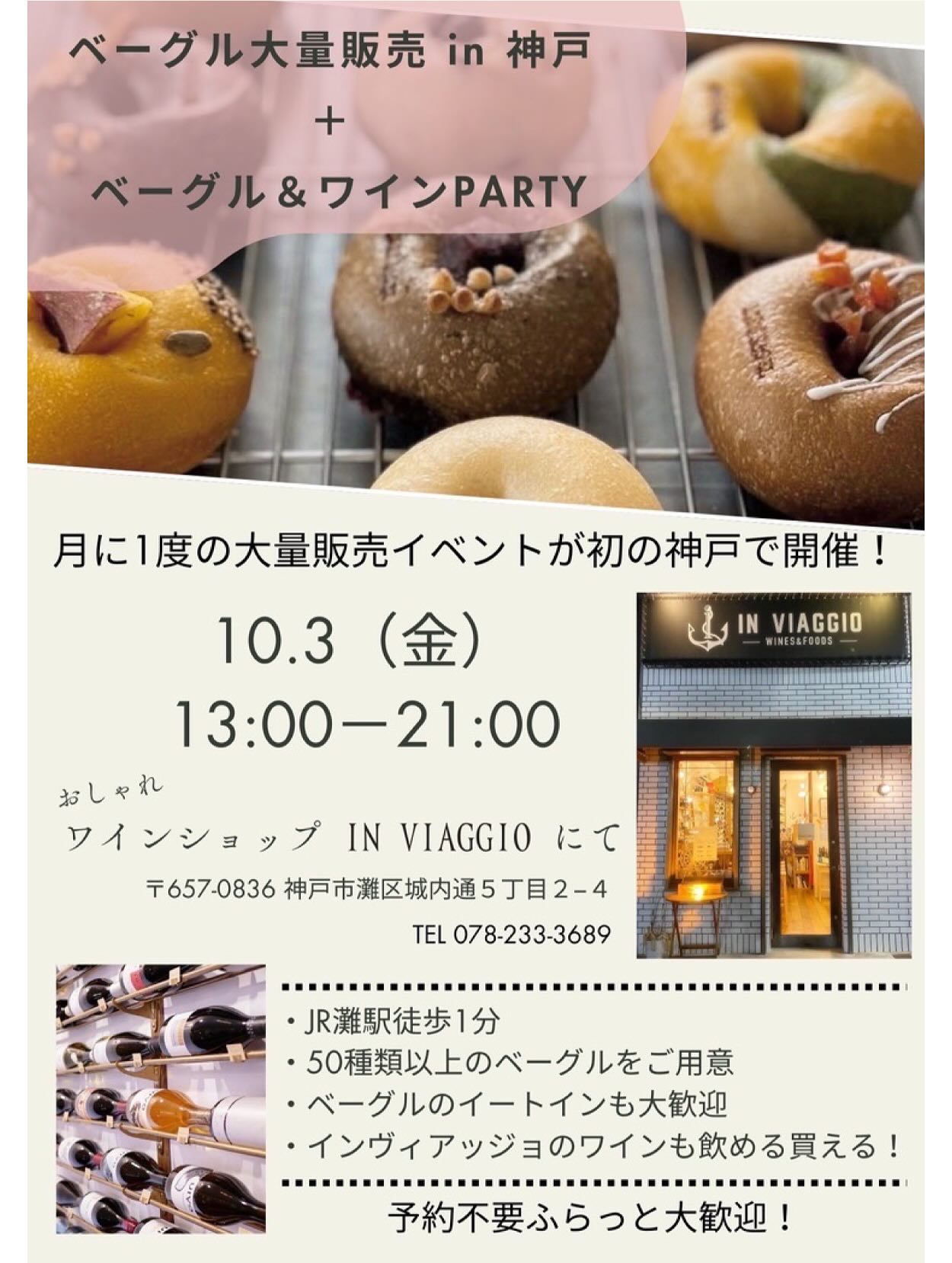 【10/3(金)ベーグルxワインでイベントやります!】 先月の7周年イベント「アテあるWeekend」で 2週目にご登場いただいた Mr.Bake and Mrs.Grapeさんと ベーグル販売&ベーグルとワインのイベントを開催します @mr.bake_and_mrs.grape 10月3日(金)13:00〜21:00 ・ベーグル販売 ・イートインでグラスワイン&ベーグル *ご予約は不要です *お取り置き承ります ベーグルのラインナップはあらためてご案内します Mr.Bake and Mrs.Grapeさんは インヴィアッジョの中の人の地元・加古川のお店で インスタでは「ベーグルとワインの専門店」となってますが 超絶コスパのランチ&ディナーが大評判で 2ヶ月先の予約まであっという間に埋まるほどの大人気店です また店主のアイコさんはソムリエにして ワインインポーター勤務経験もあり ご自身でもベーグルを焼かれるんですが 全国からさまざまなベーグルをお取り寄せして 販売するイベントを定期的に開催していて そのイベントを今回はインヴィアッジョで開催しよう ということになりました ベーグルのラインナップは Mr.Bake and Mrs.Grapeさんにおまかせしていますが きっとバラエティ豊富なハズなので ワインもいろいろ合わせて飲んでいただきたいです Mr.Bake and Mrs.Grapeさんは ファンの多いお店様ではありますが 加古川からの遠征なので今回こそは インヴィアッジョにも何人かはファンがいると信じて ぜひともお越しいただきたい! 当店の常連のお客様は 「自分たちは普段行ってるから イベントは他のお客さんのために遠慮しておこう」 という奥ゆかしい方が多く あまりイベントにはご参加いただけないことが多いです いいですかみなさん こちとら常連のお客様なら来ていただけると信じて イベントやってるんです! どこのイベントにも呼んでもらえない 店の目の前で開催されたイベントにすら 呼んでもらえないから 自前でイベントやるしかないんです! どうかひとつ! よろしくお願いします! IN VIAGGIO インヴィアッジョ 神戸市灘区城内通5-2-4 13:00〜22:00 不定休 #インヴィアッジョ #inviaggio #イタリア #ワイン #ワインショップ #wine #神戸 #kobe #灘 #岩屋 #王子公園 #王子公園駅 #王子公園カフェ #王子公園グルメ #王子動物園 #兵庫県立美術館 #水道筋 #水道筋商店街 #昼飲み #角打ち #グラスワイン #ワインセミナー #チーズ #ピッツァ #ナチュールワイン #ナチュラルワイン #自然派ワイン