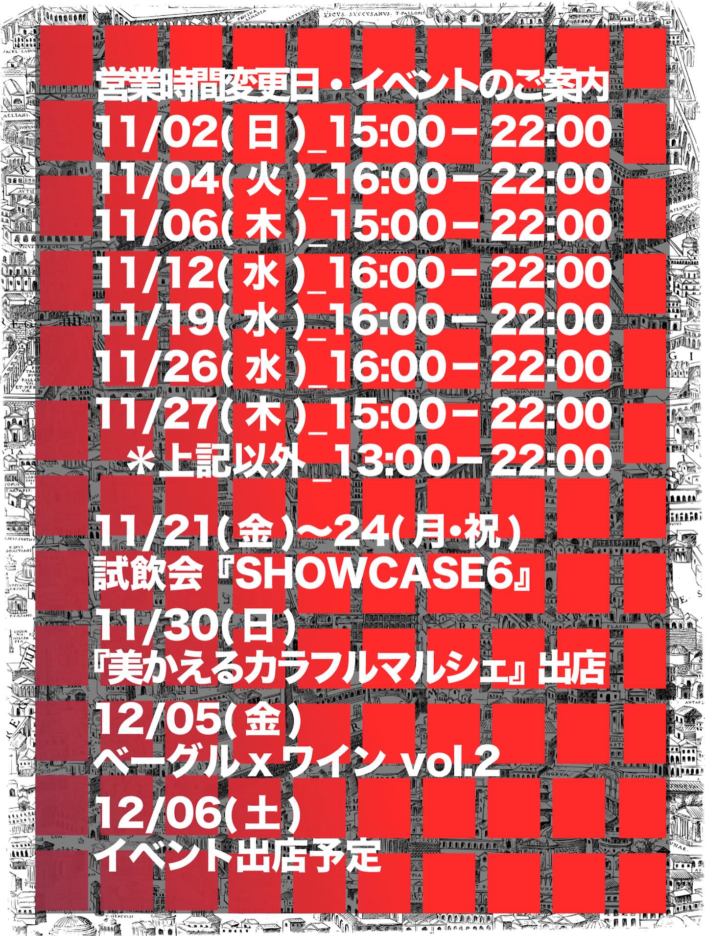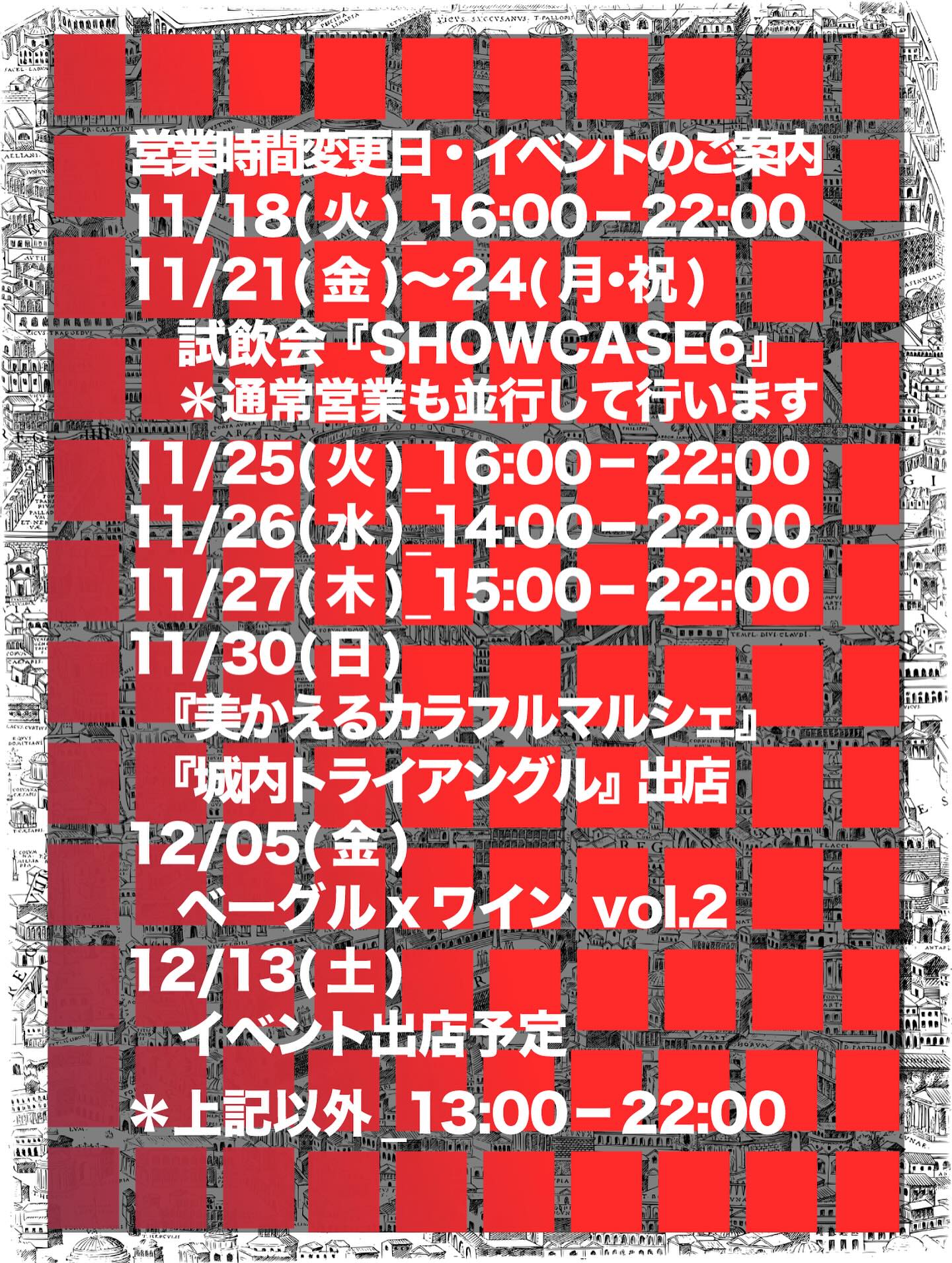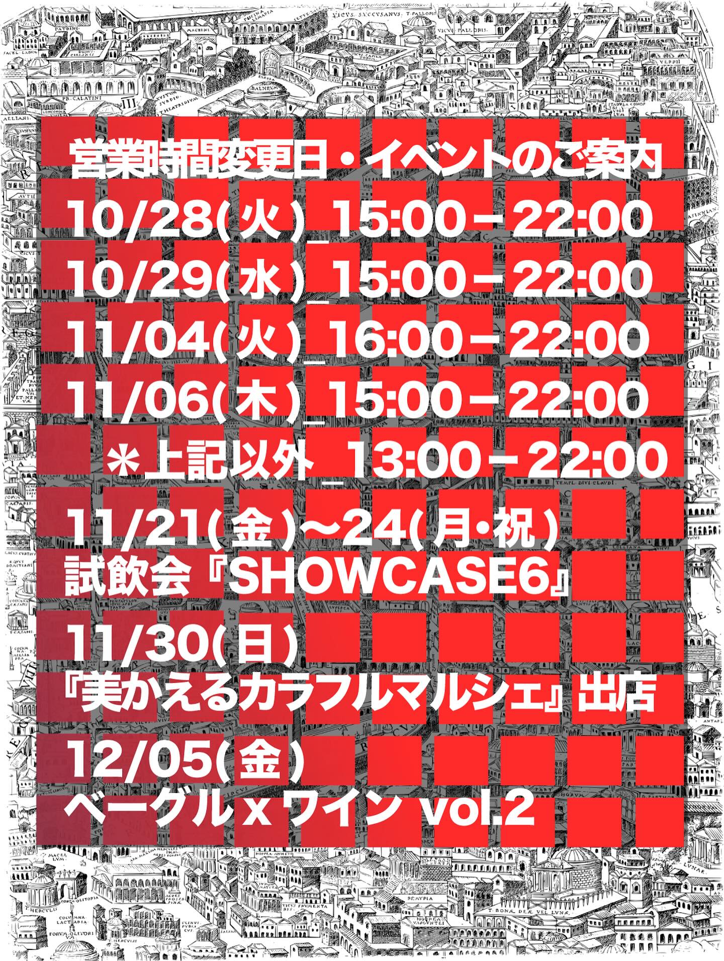 【営業時間変更日とイベントのご案内】 11/02(日):15時オープン 11/04(火):16時オープン 11/06(木):15時オープン 11/12(水):16時オープン 11/19(水):16時オープン 11/26(水):16時オープン 11/27(木):15時オープン 11/21(金)〜24(月・祝)13:00〜22:00 試飲会『SHOWCASE 6』 一般のお客様対象の試飲会です ご予約不要 お好きな時間にご来店ください *詳細はひとつ前の投稿をご覧ください 11/30(日) 『美かえるカラフルマルシェ』出店 兵庫県立美術館様にお誘いいただきまして 阪神岩屋駅南のBBプラザで開催されるイベントに グラスワイン販売で出店します 初めて参加するイベントなので どんな感じなのか全然分からないんですが もしかしたらホットワインとかコーヒーとかも 出すかもです 12/05(金) Mr.Bake and Mrs.Grapeさんとのコラボイベント ベーグルxワイン vol.2 今月初めに開催したベーグル販売と ベーグルxワインのペアリングのイベントが 大好評をいただきまして 調子のっちゃって2回目の開催です ベーグルをアテにワインを飲んでいただくのもOK ベーグルご購入だけでも大歓迎です 前回はMr.Bake and Mrs.Grapeさんのお客様が ほとんどでした 今回こそ当店のお客様にお越しいただきたい ユノウワライミーン? 12/06(土) イベント出店のお誘いをいただきました 詳細はあらためてご案内致します IN VIAGGIO インヴィアッジョ 神戸市灘区城内通5-2-4 13:00〜22:00 不定休 #インヴィアッジョ #inviaggio #イタリア #ワイン #ワインショップ #wine #神戸 #kobe #灘 #岩屋 #王子公園 #王子公園駅 #王子公園カフェ #王子公園グルメ #王子動物園 #兵庫県立美術館 #水道筋 #水道筋商店街 #昼飲み #角打ち #グラスワイン #ワインセミナー #チーズ #ピッツァ #ヴァンナチュール #ナチュラルワイン #自然派ワイン