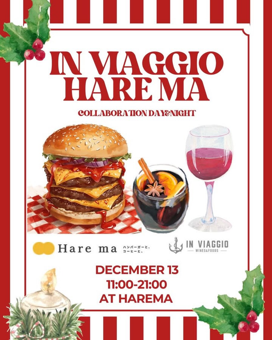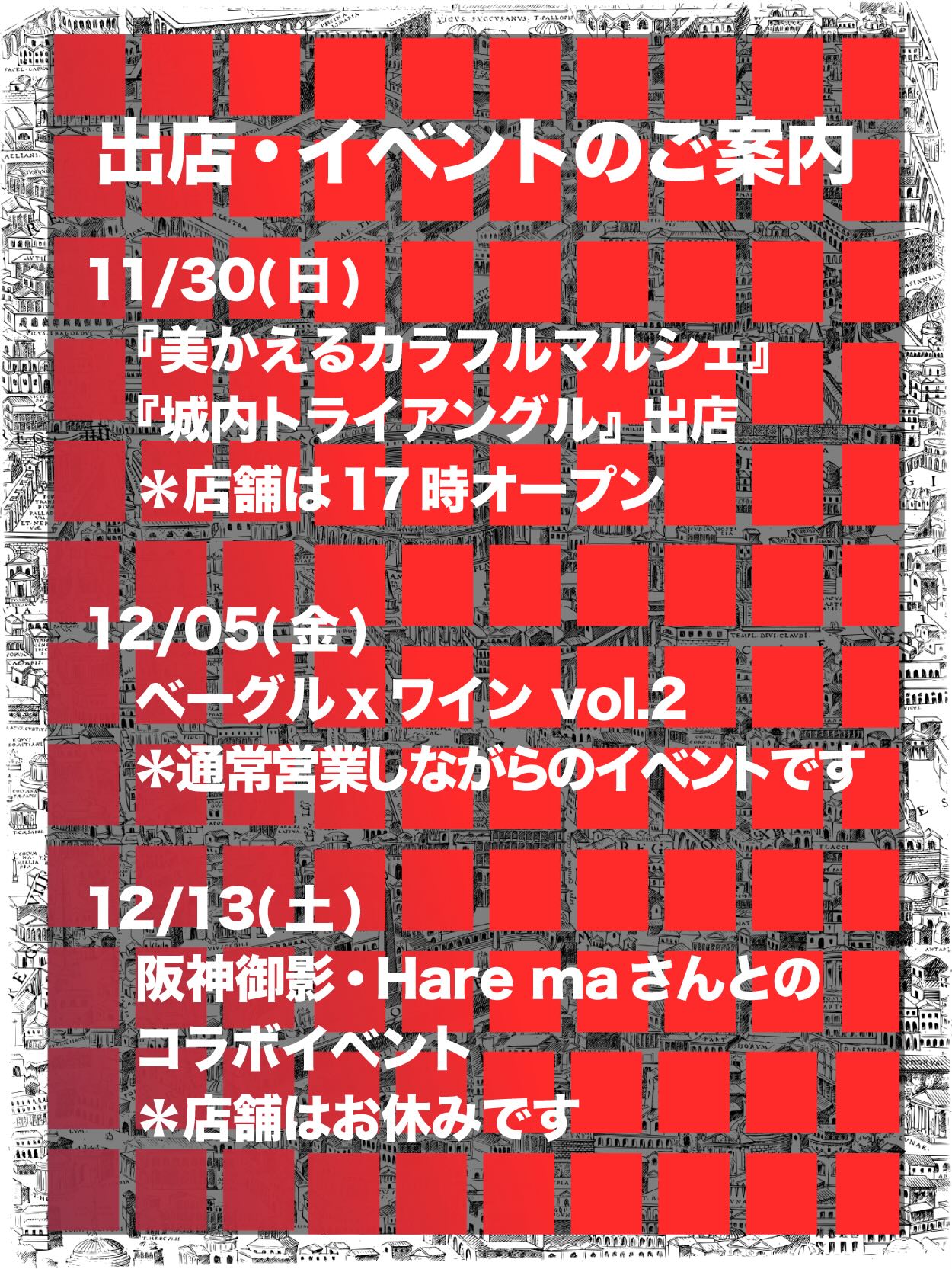 11/30(日) *16時より営業します 『美かえるカラフルマルシェ』出店 会場:阪神岩屋駅南「BBプラザ」 時間:10:30〜15:30 グラスワイン・コーヒー販売 @hyogo_pref_museum_of_art 『城内△(シロノウチトライアングル)』出店 会場:「ゲストハウスMAYA」前 時間:11:00〜17:00 ホットワイン販売 @shironouchi_triangle *僕は『美かえるカラフルマルシェ』の方にいます 12/05(金) *通常営業しながらのイベントです Mr.Bake and Mrs.Grapeさんとのコラボイベント ベーグルxワイン vol.2 会場:インヴィアッジョ 時間:13:00〜21:00(20:30 L.O.) ベーグルをアテにワインを飲んでいただくのもOK ベーグルご購入だけでも大歓迎です @mr.bake_and_mrs.grape 12/13(土) *店舗営業はお休みです Hare maさんのイベントに出店します 会場:Hare ma 時間:11:00〜21:00 阪神御影駅徒歩1分のハンバーガー屋さん Hare maさんのイベントに出店します インヴィアッジョはワイン8種類と ノンアルスパークリング&ホットワインも出します! Hare maさんはハンバーガー以外にも 特別メニューをいろいろ用意してくれてるみたいです @majimanoma 全部とは言いません! どれかひとつでも お時間ございましたら ぜひお越しください IN VIAGGIO インヴィアッジョ 神戸市灘区城内通5-2-4 13:00〜22:00 不定休 #インヴィアッジョ #inviaggio #イタリア #ワイン #ワインショップ #wine #神戸 #kobe #灘 #岩屋 #王子公園 #王子公園駅 #王子公園カフェ #王子公園グルメ #王子動物園 #兵庫県立美術館 #水道筋 #水道筋商店街 #昼飲み #角打ち #グラスワイン #ワインセミナー #チーズ #ピッツァ #ヴァンナチュール #ナチュラルワイン #自然派ワイン